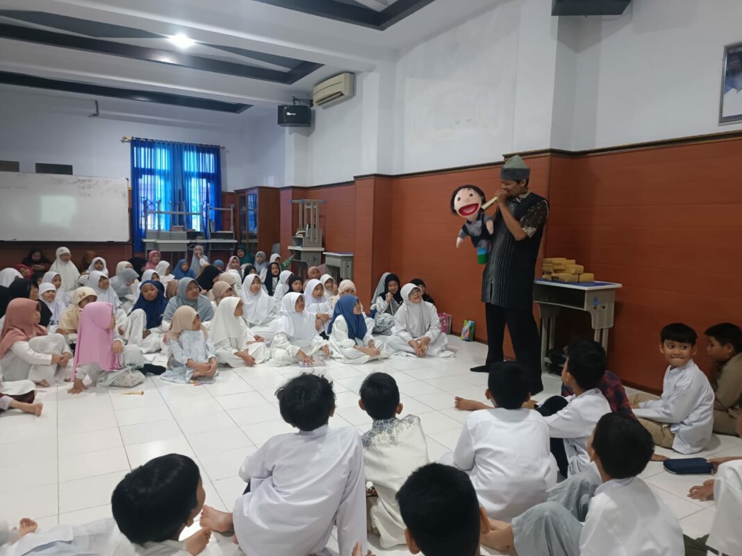 Dalam penyampaian cerita, Kak Arno didampingi Dino, boneka kesayangannya, untuk membuat suasana lebih interaktif dan menarik bagi murid.