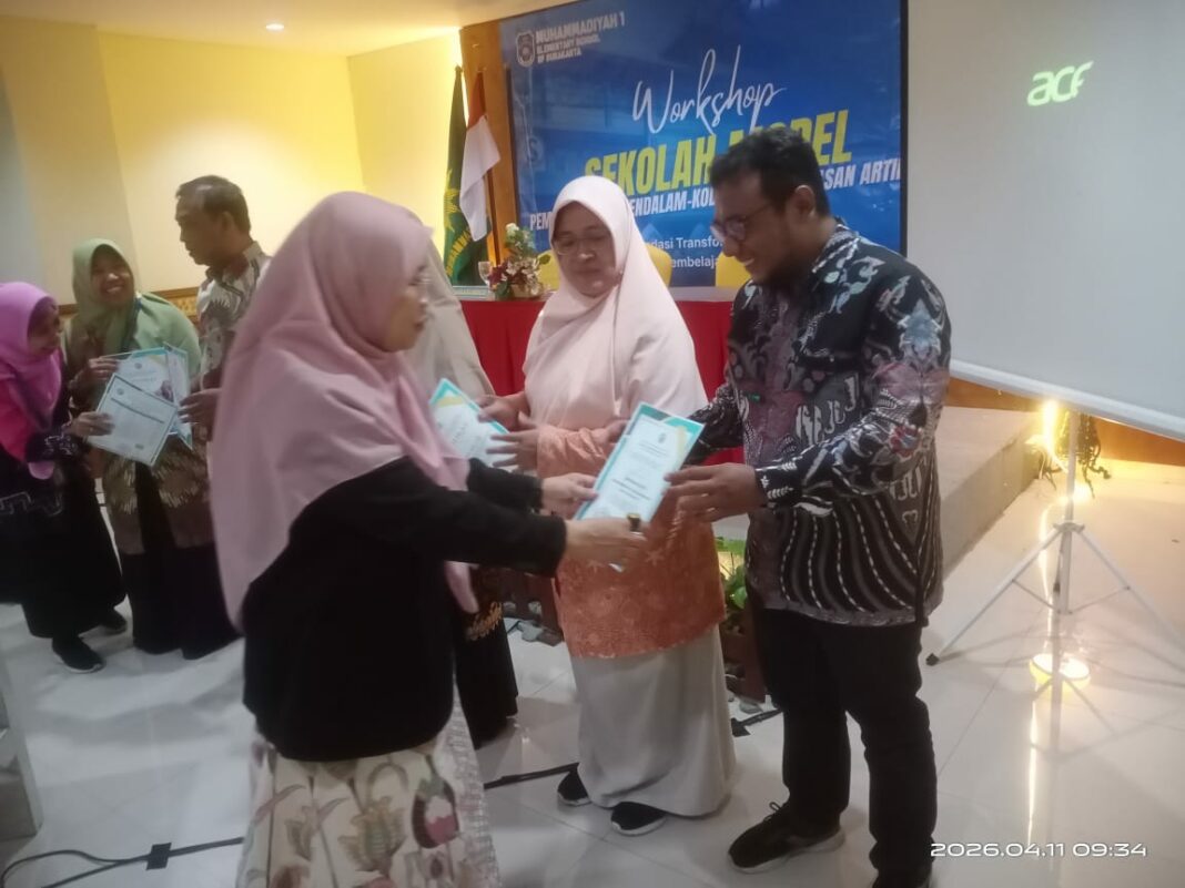 Penyerahan sertifikat dilakukan secara simbolis oleh Kepala Sekolah SD Muhammadiyah 1 Solo, Sri Sayekti, kepada tujuh perwakilan guru dan karyawan. Kegiatan ini berlangsung bersamaan dengan workshop bertema model pembelajaran mendalam, koding, dan kecerdasan artifisial di Red Chilies Hotel Solo, Sabtu (11/4/2026).