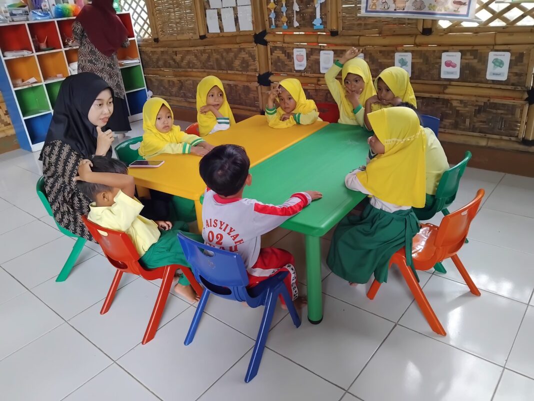 Usai shalat dhuha, kegiatan belajar dilanjutkan dengan apersepsi yang penuh warna. Salah satu momen menggelitik terjadi ketika guru mengajak anak-anak bernyanyi riang: “Apa kata jari telunjuk sayang?” Tiba-tiba seorang murid menjawab polos, “Tidak boleh acung-acung.” Jawaban sederhana namun jujur itu membuat suasana kelas semakin cair, sekaligus menunjukkan kecerdasan alami anak usia dini yang berani mengekspresikan pikirannya tanpa takut salah.