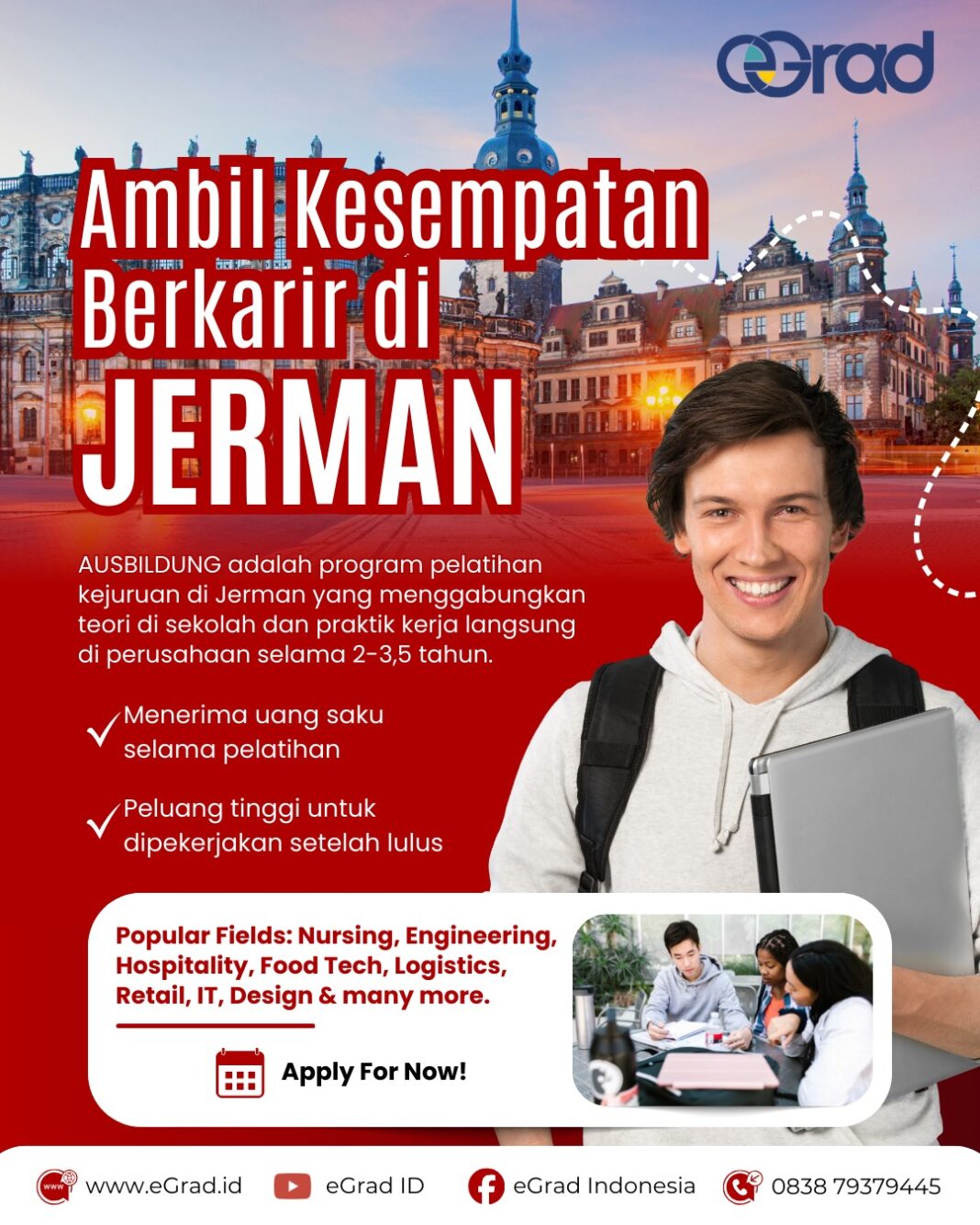 Program *Ausbildung* menjadi peluang yang sangat strategis bagi anak muda Indonesia yang ingin mengembangkan karier di negara maju, meningkatkan kualitas hidup, dan membangun pengalaman profesional internasional. Dengan dukungan persiapan terstruktur yang diberikan oleh *eGrad*, peserta dapat memasuki dunia kerja di Jerman dengan kesiapan kompetensi dan bahasa yang optimal.