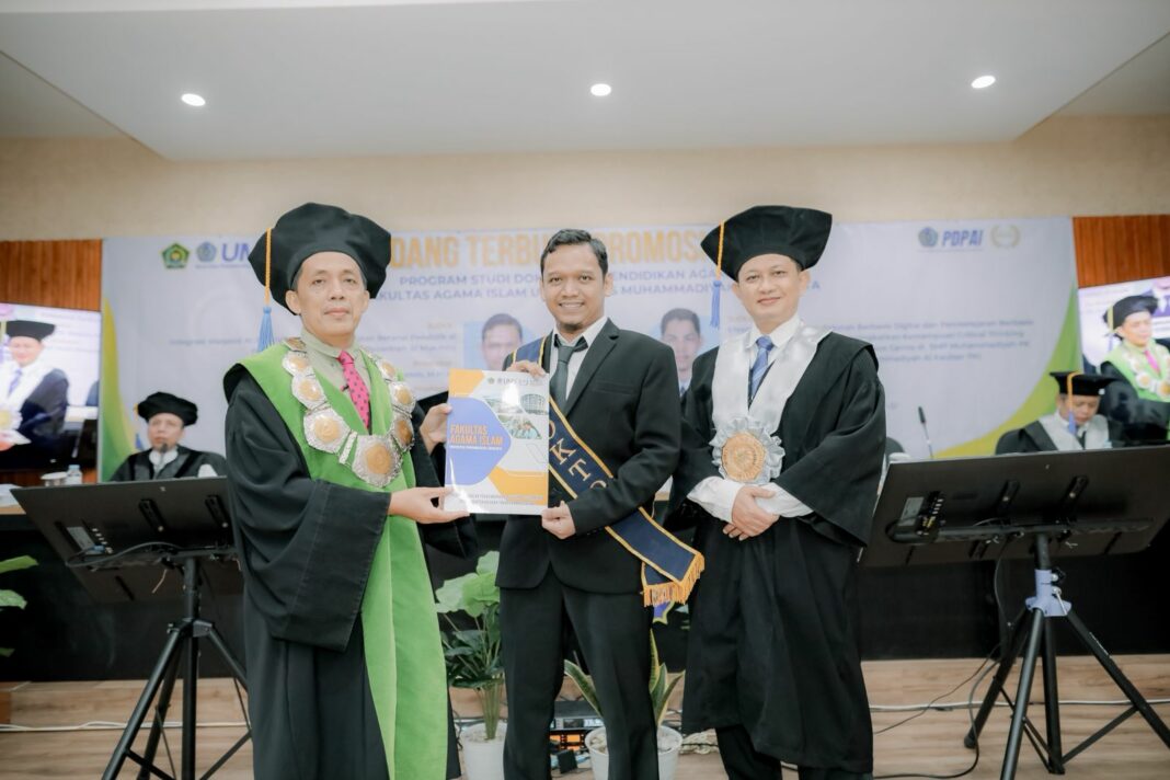 SOLO, MENARA62.COM – Program Doktor Pendidikan Agama Islam (PAI) https://www.ums.ac.id/program-studi/doktoral-pendidikan-agama-islam Universitas Muhammadiyah Surakarta https://www.ums.ac.id/ (UMS) kembali menambah deretan lulusan doktoralnya dengan mengukuhkan Muhammad Nur Latif sebagai doktor ke-63. Ia dinyatakan lulus setelah berhasil mempertahankan disertasinya dalam sidang promosi doktor, sekaligus meraih predikat cumlaude dengan Indeks Prestasi Kumulatif (IPK) 3,89.