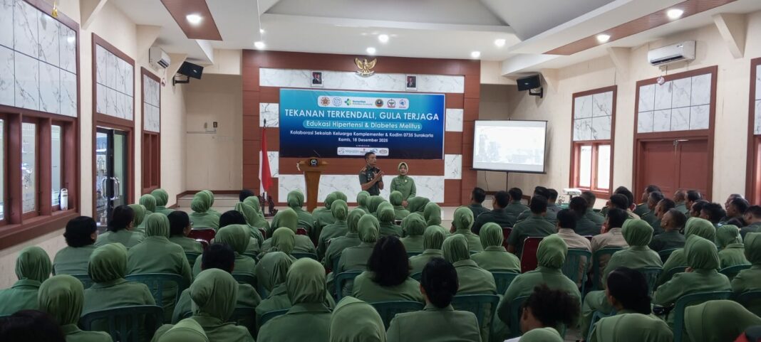 SOLO, MENARA62.COM – Upaya meningkatkan kesadaran hidup sehat terus digalakkan. Sekolah Keluarga Komplementer (SEKUTER) berkolaborasi dengan Kodim 0735/Surakarta menggelar Edukasi Hipertensi dan Diabetes Melitus, Kamis (18/12/2025), bertempat di Aula Darmawangsa Kodim 0735 Surakarta. Kegiatan ini diikuti sekitar 200 peserta yang terdiri dari prajurit TNI, Persit, dan keluarga besar Kodim Surakarta.