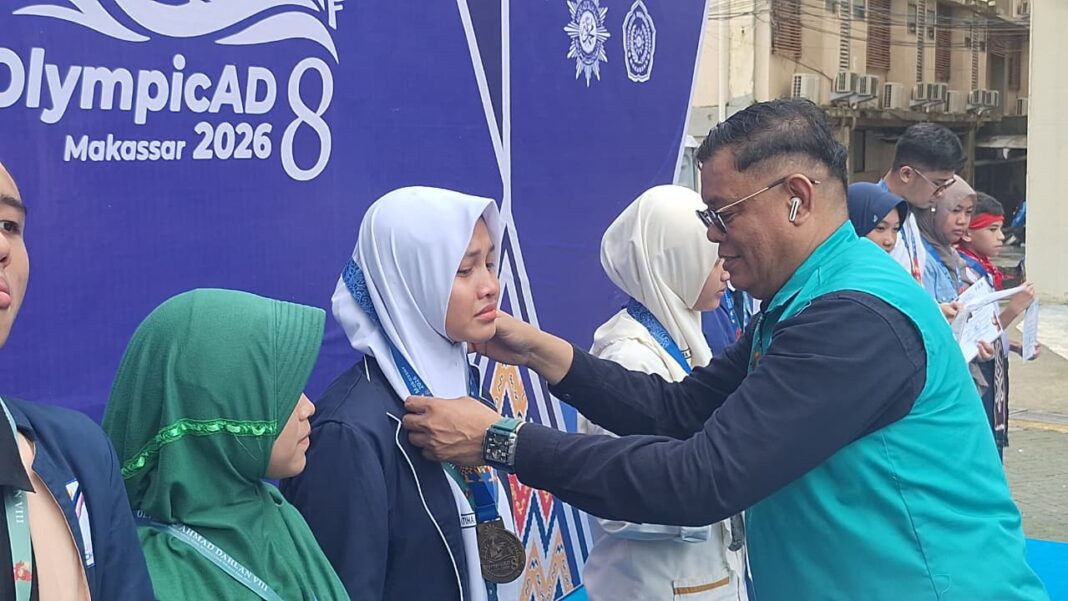 MAKASSAR, MENARA62.COM – Tangis haru pecah di atas panggung saat nama Fatihah Naimada Syarofana diumumkan sebagai peraih medali emas kategori News Reading in English tingkat SMP dalam ajang OlympicAD Nasional VIII, Sabtu (14/2/2026).