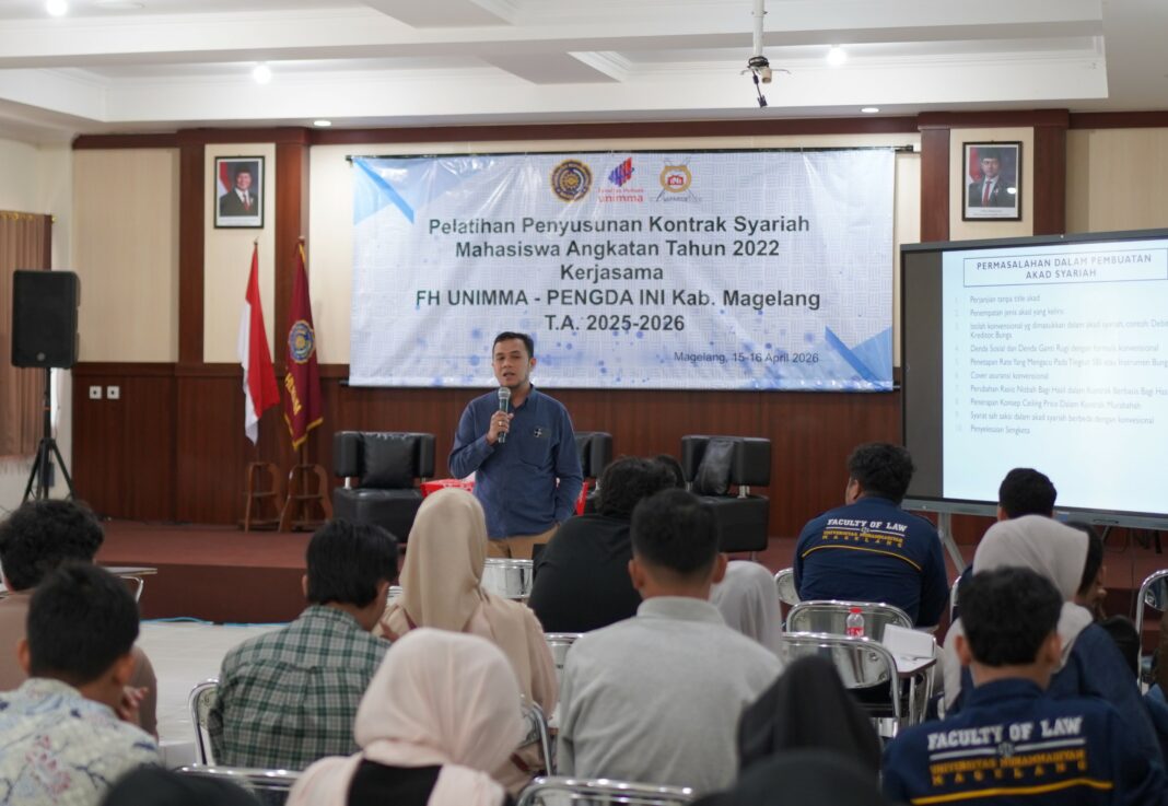 MAGELANG, MENARA62.COM – Fakultas Hukum (FH) Universitas Muhammadiyah Magelang (UNIMMA) terus mendorong penguatan kompetensi praktis lulusannya. Salah satunya melalui penyelenggaraan Pelatihan Penyusunan Kontrak Syariah yang diikuti oleh mahasiswa semester 8. Rangkaian kegiatan dilaksanakan pada Rabu dan Kamis (15–16/4) di Aula Fikes Kampus 2 UNIMMA dengan mengusung tema “Meningkatkan Kompetensi Hukum Mahasiswa melalui Praktik Penyusunan Kontrak Syariah”.
