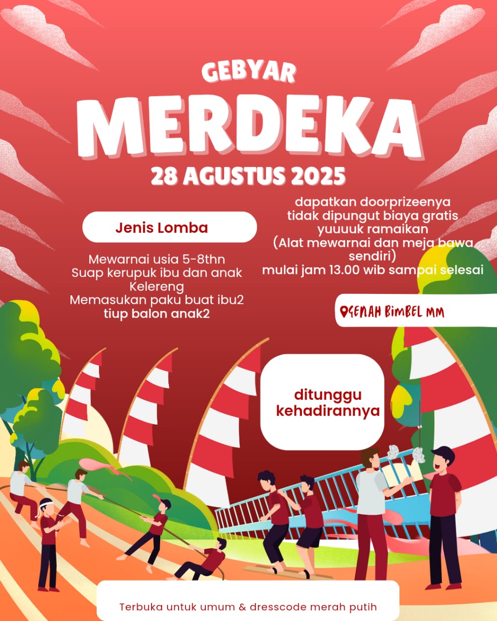 Kegiatan 17 Agustusan ini diikuti oleh para peserta didik Genah Bimbel MM, didampingi oleh orang tua, serta melibatkan masyarakat sekitar. Berbagai lomba tradisional, kegiatan kebersamaan, dan doa bersama untuk bangsa menjadi rangkaian utama acara, yang bertujuan untuk mempererat silaturahmi sekaligus menanamkan nilai-nilai perjuangan kepada generasi muda.