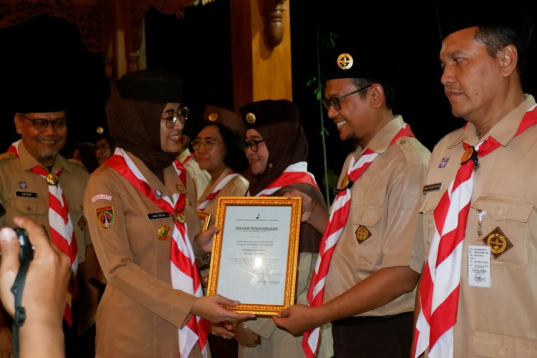 SOLO, MENARA62.COM – Gugusdepan (Gudep) SMP Negeri 22 Kota Surakarta menorehkan prestasi membanggakan dengan meraih predikat Gugusdepan Mantap 2025. Piagam penghargaan diserahkan langsung oleh Wakil Wali Kota Surakarta sekaligus Ketua Harian Majelis Pembimbing Cabang (Mabicab) Kota Surakarta, Kak Astrid, dalam acara Ulang Janji Pramuka di Bumi Perkemahan Karya Bakti Praja Mukti, Jurug, Rabu malam (13/8).