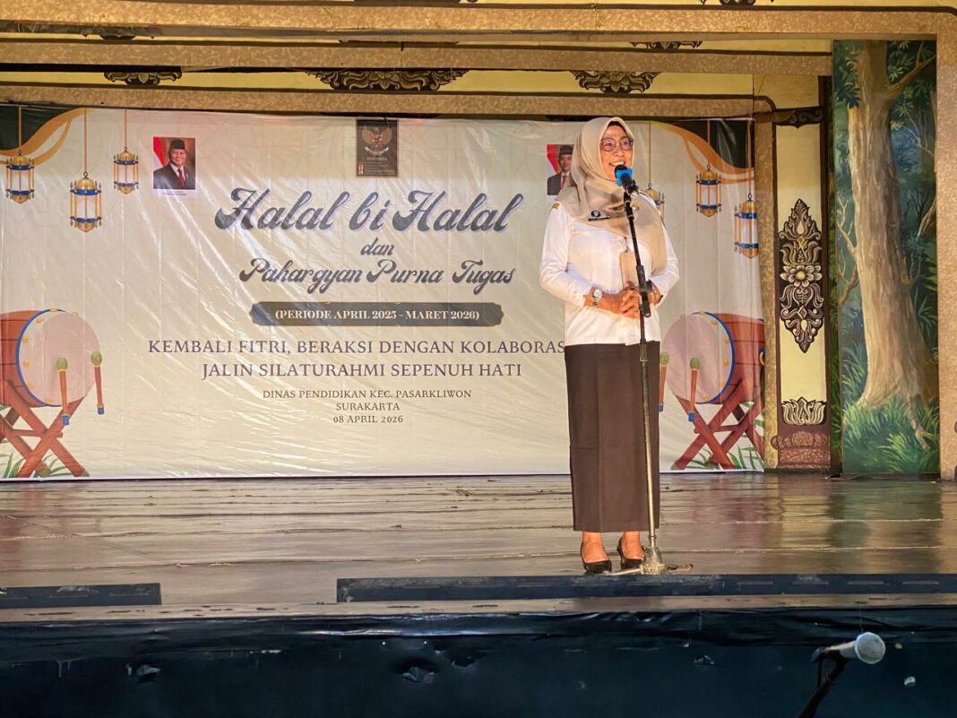 SOLO, MENARA62.COM – Suasana hangat penuh kebersamaan mewarnai kegiatan Halal Bihalal dan Pahargyan Purna Tugas Dinas Pendidikan Kecamatan Pasarkliwon, Kota Surakarta, Rabu (8/4/2026). Mengusung tema “Kembali Fitri, Beraksi dengan Kolaborasi Jalin Silaturahmi Sepenuh Hati”, kegiatan ini digelar di Gedung Wayang Orang Sriwedari.