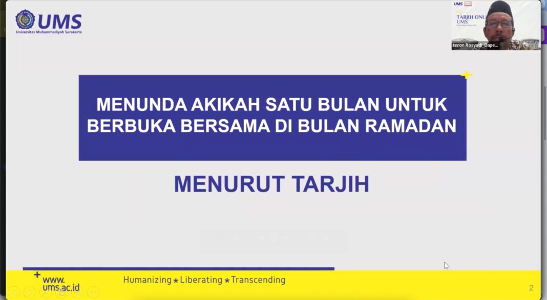 SOLO, MENARA62.COM – Universitas Muhammadiyah Surakarta (FAI UMS) kembali menyelenggarakan Kajian Tarjih Online ke-206 yang ditujukan bagi civitas academica UMS serta pemirsa TV Muhammadiyah (TVMU) Selasa, (30/12). Kajian yang disiarkan secara daring ini menghadirkan Dr. Imron Rosyadi, M.Ag., dosen Fakultas Agama Islam (FAI) UMS, sebagai narasumber utama.