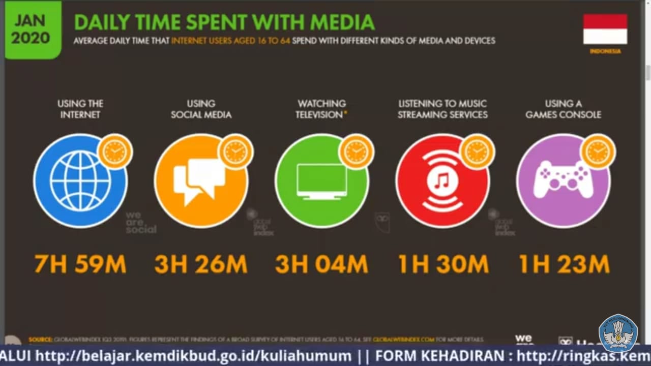 Berdasarkan data, masyarakat Indonesia saat ini menghabiskan waktu berkisar antara 7 hingga 8 jam/hari untuk mengakses internet. Rerata waktu tersebut mengalahkan jumlah jam yang dihabiskan oleh masyarakat untuk menonton televisi.