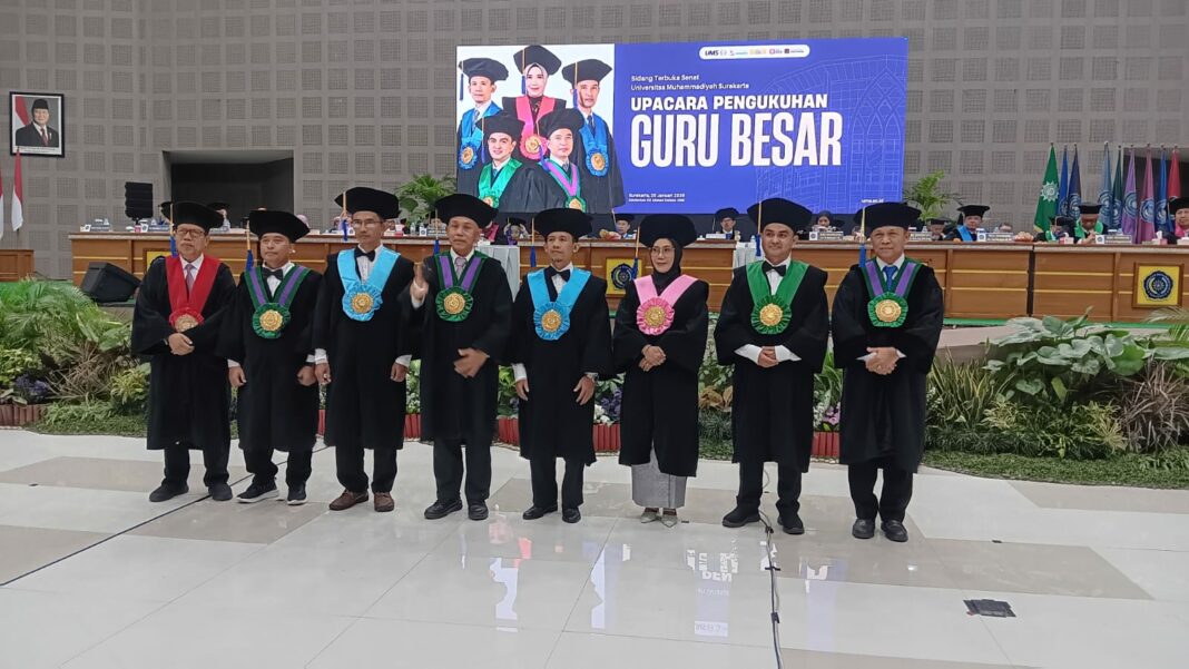 SOLO, MENARA62.COM – Universitas Muhammadiyah Surakarta (UMS) mengukuhkan lima guru besar dalam Sidang Senat Terbuka yang diselenggarakan pada Selasa, (20/1), bertempat di Edutorium KH. Ahmad Dahlan UMS. Kegiatan ini dihadiri oleh jajaran pimpinan universitas, para guru besar UMS, serta keluarga dan kolega para profesor yang dikukuhkan.