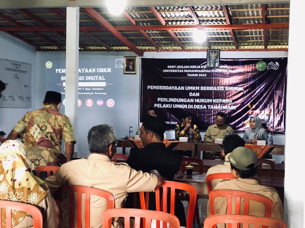 Kegiatan Pemberdayaan UMKM Berbasis Digital dan Perlindungan Hukum Kepada Pelaku UMKM Desa Tanahsari, Kebumen ini diselenggarakan di Balai desa Desa Tanahsari, Kebumen. Acara diawali dengan sosialisasi Pengembangan Potensi Desa melalui Kewirausahaan yang disampaikan oleh Meriam Esterina, M.Psi., Psikolog. Narasumber yang sekaligus menjadi Dosen Pembimbing Lapangan (DPL) Tim KKN-T Universitas Muhammadiyah Purworejo ini menyampaikan mengenai berbagai hal yang dapat dikembangkan sebagai potensi desa dan meningkatkan motivasi masyarakat untuk berwirausaha.