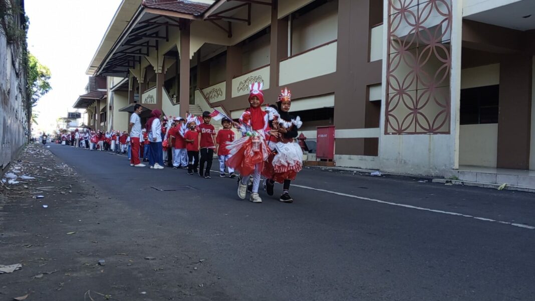 SOLO, MENARA62.COM – Suasana semarak merah putih memenuhi jalanan Gajahan, Surakarta, pada Jumat (15/8), saat SD Muhammadiyah 24 Gajahan menggelar Jalan Sehat memperingati HUT ke-80 Republik Indonesia. Kegiatan ini diikuti seluruh siswa kelas 1 hingga 6 dengan rute dari halaman sekolah, melewati depan Kantor Kelurahan Gajahan, menuju utara, melewati Pasar Klewer, lalu berhenti sejenak di depan Kori Kamandungan Keraton Surakarta Hadiningrat untuk istirahat dan berfoto, sebelum kembali ke sekolah.