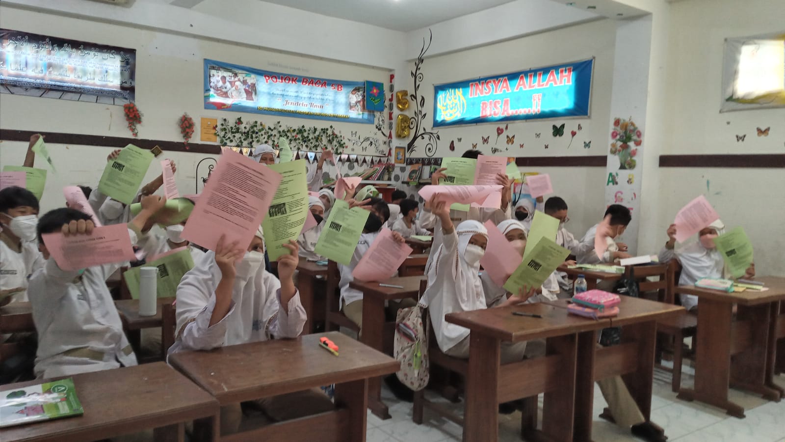 Langkah selanjutnya, guru membagikan ketiga lembar kerja tersebut kepada semua murid. Guru menginstruksikan bahwa pengerjaan lembar kerja dimulai dari yang berwarna hijau. Jika sudah selesai bisa dilanjutkan untuk mengerjakan lembar kerja yang berwarna kuning dan merah.