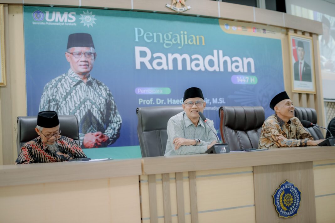 SOLO, MENARA62.COM – Universitas Muhammadiyah Surakarta (UMS) menggelar Pengajian Ramadan yang dirangkai dengan buka puasa bersama pada Kamis (12/3) di Ruang Seminar Lantai 7 Gedung Induk Siti Walidah UMS. Kegiatan ini dihadiri oleh jajaran pimpinan UMS, civitas academica, serta Ketua Umum Pimpinan Pusat Muhammadiyah Prof. Dr. H. Haedar Nashir, M.Si.