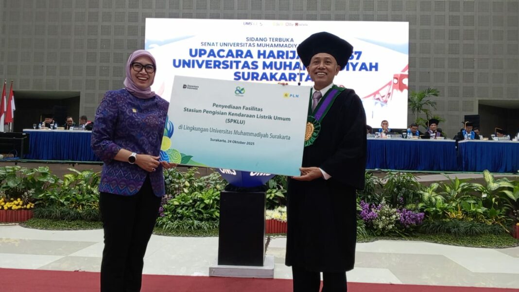 SOLO, MENARA62.COM – Bertepatan dalam rangka memperingati Hari Jadi ke-67, Universitas Muhammadiyah Surakarta (UMS) menerima bantuan berupa fasilitas Stasiun Pengisian Kendaraan Listrik Umum (SPKLU) dan unit Mini Remote Terminal Unit (RTU) sistem Supervisory Control And Data Acquisition (SCADA) dari PT Perusahaan Listrik Negara (PLN) (Persero). Penyerahan dilakukan langsung oleh Direktur Distribusi PLN, Arsyadany Ghana Akmalaputri, S.T., M.M, di sela Sidang Terbuka Senat Universitas Muhammadiyah Surakarta, Jumat (24/10), di Edutorium UMS.