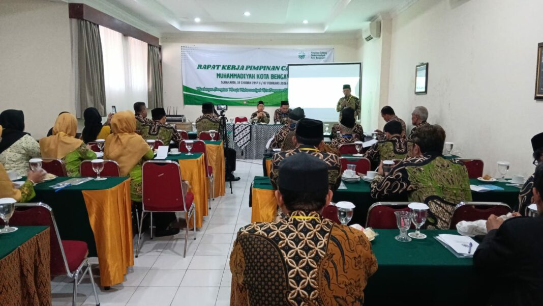 SOLO, MENARA62.COM — Pimpinan Cabang Muhammadiyah (PCM) Kota Bengawan menggelar Rapat Kerja Pimpinan Cabang (Rakerpimcab), Sabtu (7/2/2026), di Griyadi Kusuma by Sahid. Kegiatan ini mengusung tema “Membangun Sinergitas Menuju Muhammadiyah Kota Bengawan Berdaya & Berkelanjutan” dan dihadiri sekitar 37 peserta.