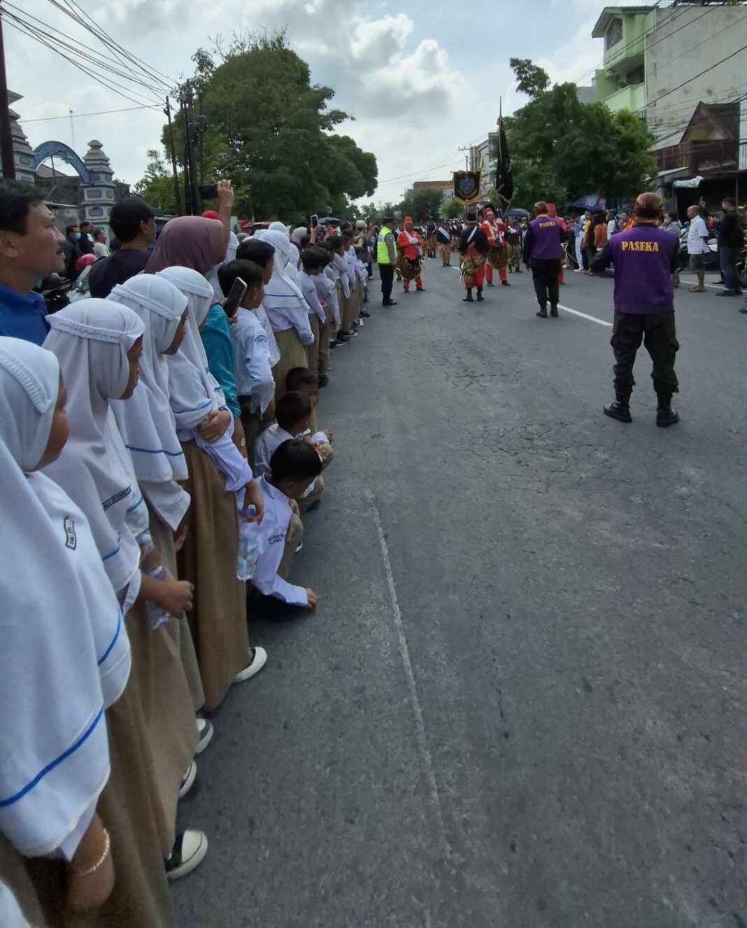 Dengan mengenakan seragam putih cokelat, para siswa berbaris rapi di tepi jalan, didampingi para guru dan tenaga kependidikan. Mereka dengan khusyuk melambaikan tangan dan menundukkan kepala saat iring-iringan layon dalem PB XIII melintas di hadapan mereka.