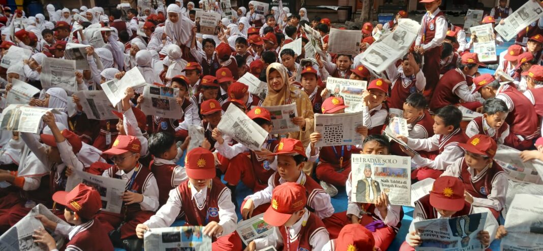 SOLO, MENARA62.COM – Sebanyak 700 peserta melakukan gerakan literasi membaca koran di mulai dari siswa-siswi, guru dan karyawan SD Muhammadiyah 1 Solo dalam rangka rayakan milad ke-113 Muhammadiyah, Senin (17/11/2025).