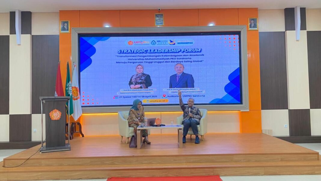 SOLO, MENARA62.COM – Rektor Universitas Muhammadiyah Surakarta (UMS) https://www.ums.ac.id Prof. Dr. Harun Joko Prayitno, M.Hum., https://www.ums.ac.id/profile/harun-joko-prayitno bersama Prof. Dr. Aisyah Endah Palupi selaku Kepala LLDIKTI Wilayah VI Jawa Tengah menjadi narasumber utama dalam sebuah kegiatan Strategic Leadership Forum. Kegiatan ini mengusung tema ‘Transformasi Pengembangan Kelembagaan dan Akademik menuju Perguruan Tinggi Unggul dan Berdaya Saing Global’.