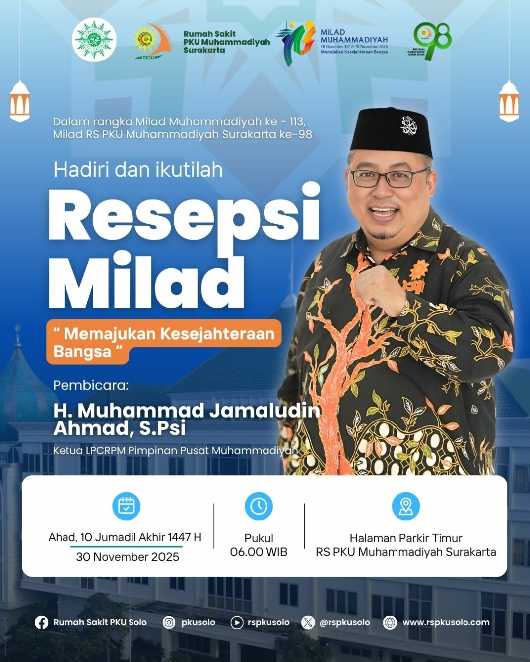 “Rumah Sakit PKU Muhammadiyah Surakarta siap menerima para tamu dan jemaah dalam rangka resepsi Milad ke-113 Muhammadiyah dan resepsi Milad ke-98 Rumah Sakit PKU Muhammadiyah Surakarta serta Hari Bermuhammadiyah,” ujarnya.