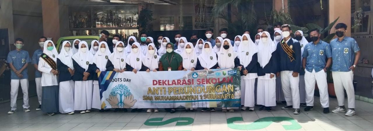 SOLO, MENARA62.COM – SMA Muhammadiyah 1 Surakarta menggelar puncak kegiatan Roots Day Deklarasi Anti Perundungan dengan mengundang Dinas Pemberdayaan Perempuan Perlindungan Anak dan Pemberdayaan Masyarakat (P3APM) serta Komite Sekolah, Rabu (22/12/2021). Deklarasi Anti Perundungan merupakan puncak rangkaian kegiatan sekolah penggerak setelah memilih 30 Agen Perubahan dan mengikuti 10 kali diklat bersama Fasilitator.