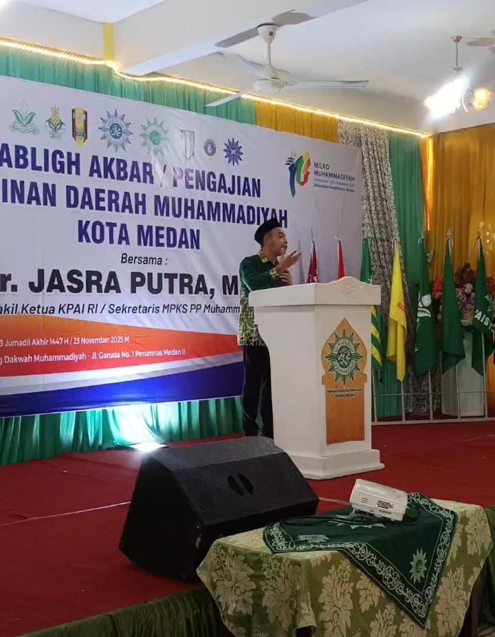 MEDAN, MENARA62.COM – Wakil Ketua Komisi Perlindungan Anak Indonesia (KPAI) sekaligus Sekretaris Majelis Pembinaan Kesejahteraan Sosial (MPKS) Pimpinan Pusat Muhammadiyah, Dr. Jasra Putra, M.Pd., menyerukan pentingnya transformasi gerakan sosial Muhammadiyah dalam merespons ancaman nyata terhadap anak-anak Indonesia. Dalam Tabligh Akbar Pimpinan Daerah Muhammadiyah (PDM) Kota Medan, Jasra menekankan bahwa perlindungan anak bukan sekadar isu sosial, melainkan mandat teologis dan kunci menuju Generasi Emas 2045.