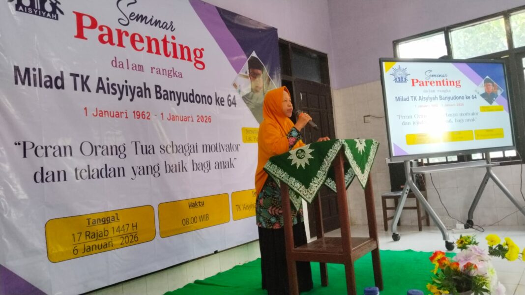 BOYOLALI, MENARA62.COM — Dalam rangka memperingati Milad ke-64, TK ‘Aisyiyah Banyudono menggelar Seminar Parenting bertema “Peran Orang Tua sebagai Motivator dan Teladan yang Baik bagi Anak” pada Selasa (6/1/2026). Kegiatan ini dilaksanakan di TK ‘Aisyiyah Banyudono dan diikuti oleh wali murid dengan penuh antusias.