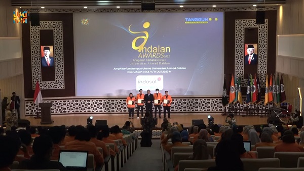 YOGYAKARTA, MENARA62.COM — Universitas Ahmad Dahlan (UAD) Yogyakarta memberikan ‘Anugerah Kemahasiswaan Universitas Ahmad Dahlan’ atau Andalan Awards bagi mahasiswa, dosen, tenaga kependidikan yang berprestasi. Penyerahan Andalan Awards dilaksanakan di Amphitarium lantai 9 Gedung Utama Kampus 4 Yogyakarta, Kamis (14/7/2022).