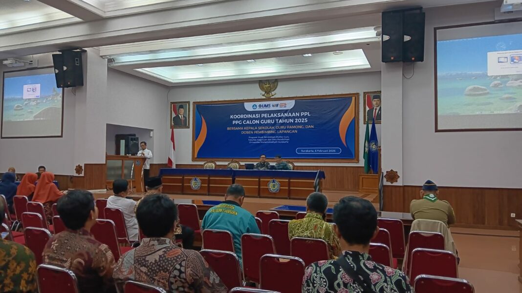 SOLO, MENARA62.COM — Universitas Muhammadiyah Surakarta (UMS) menggelar kegiatan koordinasi Pelaksanaan Praktik Pengalaman Lapangan (PPL) Pendidikan Profesi Guru (PPG) Calon Guru Tahun 2026 di Auditorium Moh. Djazman Kampus 1 UMS, Jumat (6/2/2026). Kegiatan ini menjadi langkah awal pemantapan pelaksanaan PPL yang melibatkan ratusan mahasiswa, dosen pembimbing, serta sekolah mitra.