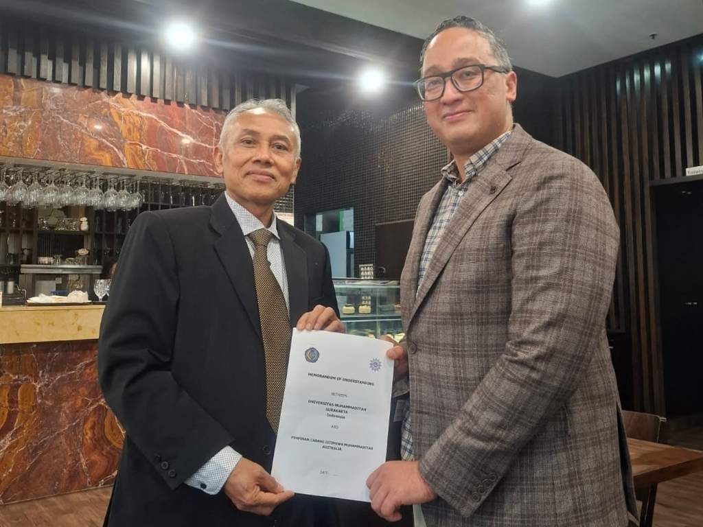 SOLO, MENARA62.COM – Universitas Muhammadiyah Surakarta (UMS) menegaskan komitmennya sebagai kampus berdaya saing global dengan menandatangani Memorandum of Understanding (MoU) bersama Pimpinan Cabang Istimewa Muhammadiyah (PCIM) Australia pada 21 November 2025 kemarin. Kesepakatan ini menjadi langkah strategis UMS dalam memperkuat kerja sama di bidang pendidikan, penelitian, layanan masyarakat, hingga kegiatan sosial berbasis dakwah Muhammadiyah. Penandatanganan ini menjadi langkah strategis UMS dalam memperluas jejaring internasional yang Islami, Mencerahkan, Unggul, Mendunia, dan Sustainable serta memberi arah perubahan.