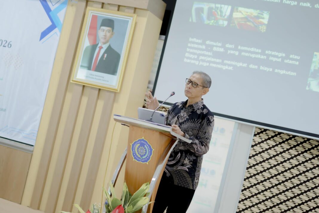 SOLO, MENARA62.COM – Pakar ekonomi sekaligus Guru Besar Fakultas Ekonomi dan Bisnis Universitas Muhammadiyah Surakarta ums.ac.id (UMS), Prof. Dr. Bambang Setiaji, M.Si., menyoroti dampak luas konflik geopolitik Timur Tengah terhadap perekonomian global dan Indonesia dalam Seminar & Rapat Anggota I 2026 yang digelar di Gedung Induk Siti Walidah UMS, Rabu (22/4).